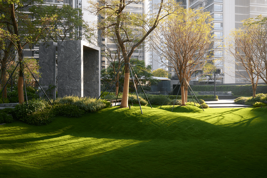 约2万㎡的地方园林犹如一方「微天气绿洲」,通过模仿天然地貌,并高密度栽植近300棵大型乔木,构成了无效的生态调理层;严酷选用蜜源取食源动物,吸引鸟语虫鸣,让生态天然轮回,从会随触碰活动的粘叶豆,到寄意相思的海红豆,再到秋天绚烂如画的乌桕,园区本身即是一座充满摸索趣味的天然博物馆,让糊口的每一天都取朝气共处。