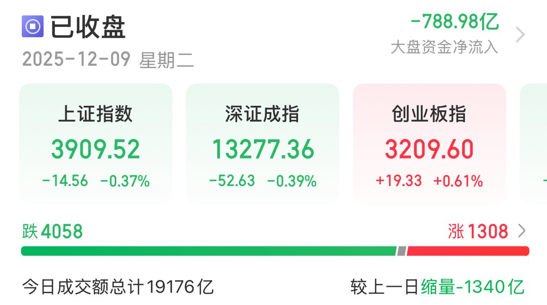 截至收盘,上证指数跌0。37%,深证成指跌0。39%,北证50跌1。72%。全市场成交额1。92万亿元,较上日成交额缩量1340亿元。