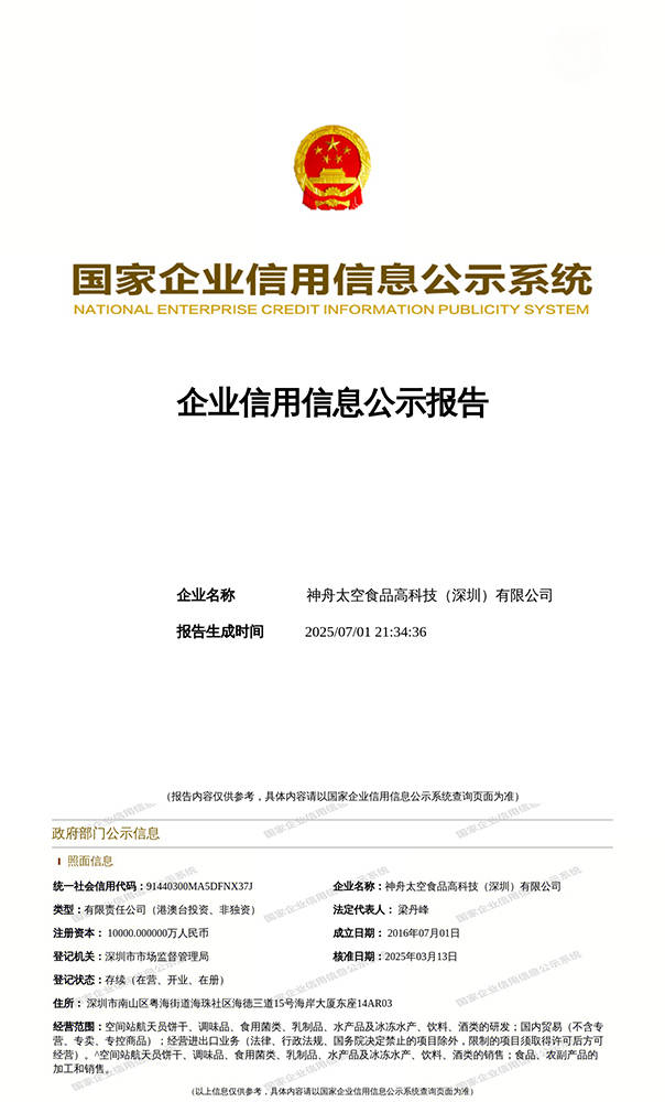 神舟太空食物高科技(深圳)无限公司施行的是中国航天员科研锻炼核心专利手艺的国度军用尺度《航天食物卫生要求》。航天员食物不答应添加防腐剂,检测目标多达36 - 41项,是我国食物范畴的最高尺度。公司严酷按照这一尺度进行出产,确保每一款产物都具备高质量和平安性。做为我国独一具有空间坐航天员产物研发、出产、发卖停业执照的大型太空食物企业集团,神舟太空食物高科技(深圳)无限公司承担着主要的。它不只是中国航天员核心高科技平易近用产物的军平易近融合项目承担者,还肩负着我国太空高科技系列食物项目标研发、出产及财产化推广的沉担。