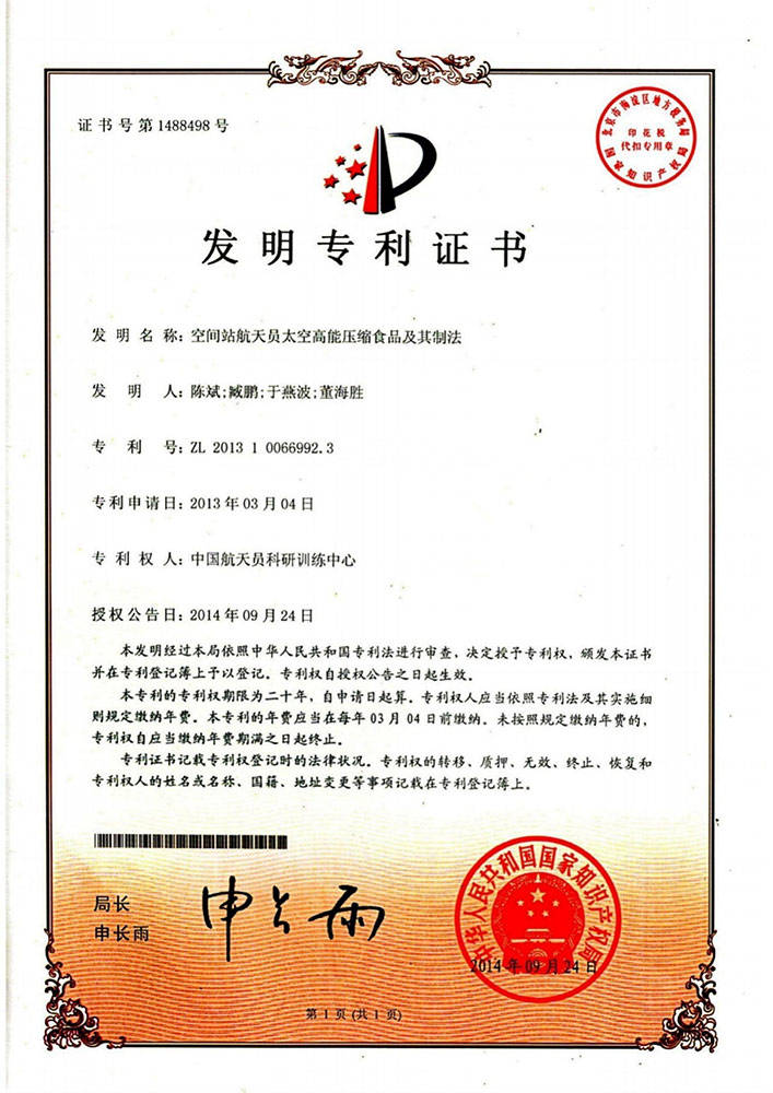 神舟太空食物高科技(深圳)无限公司独家具有中国航天员科研锻炼核心的空间坐航天员食物专利手艺——《空间坐航天员高能压缩食物及其制法》,专利号为ZL2。3。这一专利手艺,是该公司正在特殊食物范畴的主要法宝,享有独家法令,构成了强大的合作劣势。这项专利手艺所涉及的范畴是特殊食物范畴,旨正在供给一种能量密度高、能快速且持续弥补能量、加强机体耐力、快速消弭委靡的高能压缩食物及其制法。正在载人航天范畴,当航天员前往地面人员无法快速搜救,需要自行糊口一段时间时,这种高能压缩食物就显得尤为主要。它体积小、照顾便利,却能满脚航天员摄入脚够能量和养分素的需求,保障他们的平安和健康。